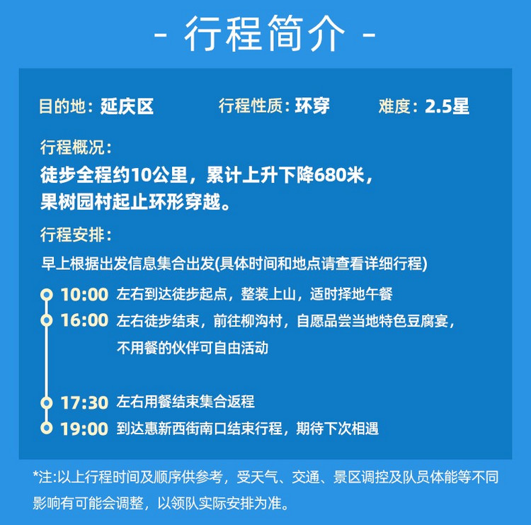 *注:以上安排为不塞车的预计时间,如果活动过程中因天气、塞车、管控、修路需要绕道而行原因导致行程延误,领队有权利对活动进行调整;