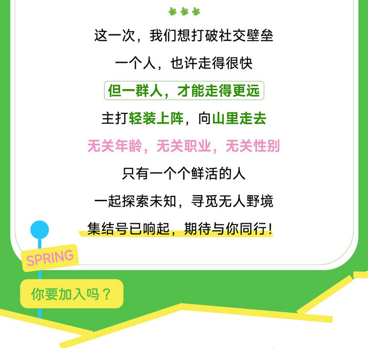 5、 此旅行给大家投保专业户外旅行意外险,保险从集合日开始到活动结束日为止。