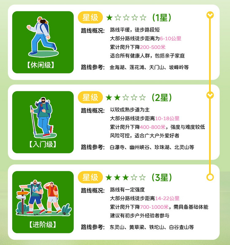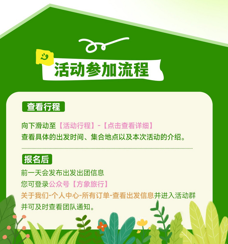 注:以上时间为正常安排时间,参与者体力不同,耗时可能会有差距。如遇天气、道路堵车、景区管控等外在因素影响,以领队安排为准。