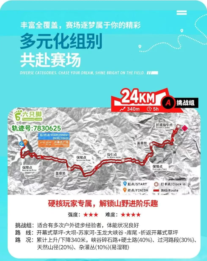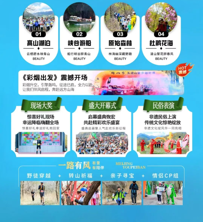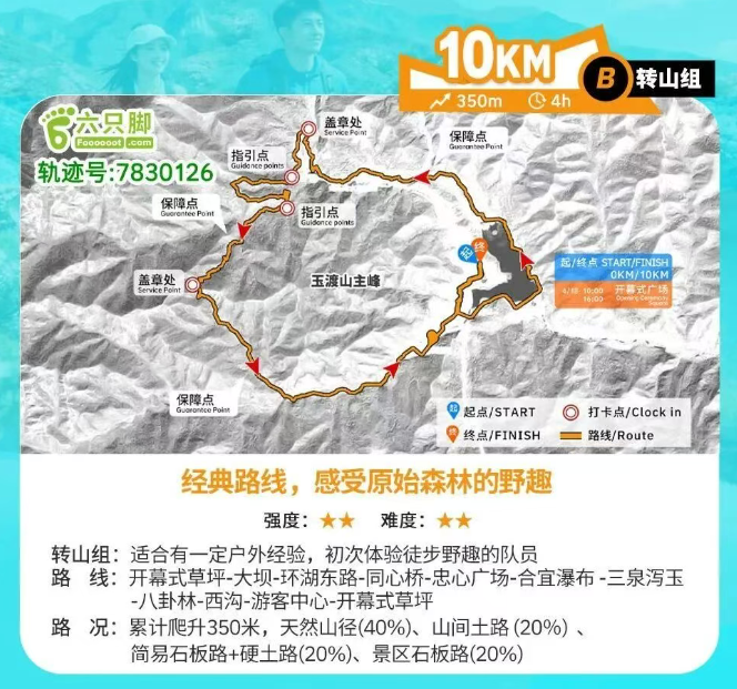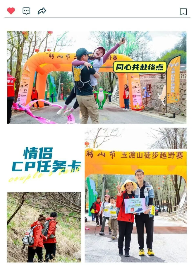 2、情侣CP组:A组B组完成情侣CP任务卡挑战,情侣2人共同闯进各组前三名(号码布盖签到章后在主会场根据名次领取纪念奖品+玉渡山全年免门票);