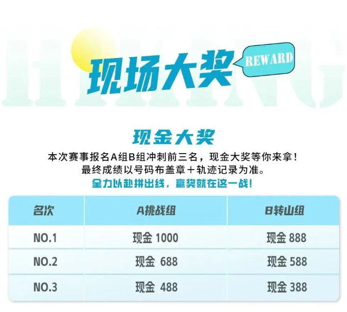 1、徒步完赛:A组B组完成挑战,冠军/季军/亚军前三名(号码布盖章+轨迹记录),颁发定制奖牌+奖杯+奖金+玉渡山全年免门票;
