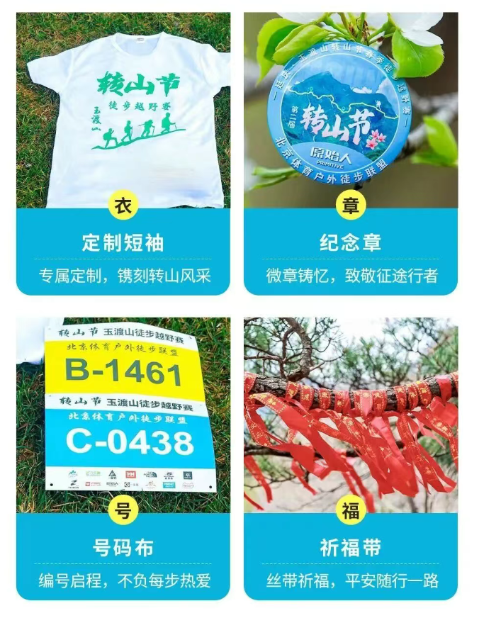 物料:为每位徒步者颁发完赛证书、定制奖牌、号码布、纪念章、定制短袖、许愿祈福带(为家庭亲子组提供寻宝地图,情侣CP组提供任务卡片);