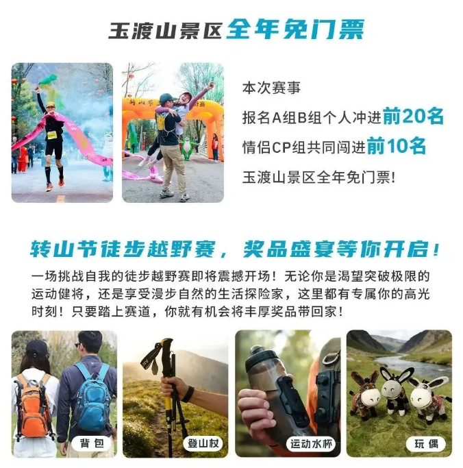 4、徒步前20名:A组B组完成挑战前20名(不含前三名),分别由赞助商提供的精美礼品一份+玉渡山全年免门票(号码布盖签到章后在主会场根据名次领取徒步证书和礼品);