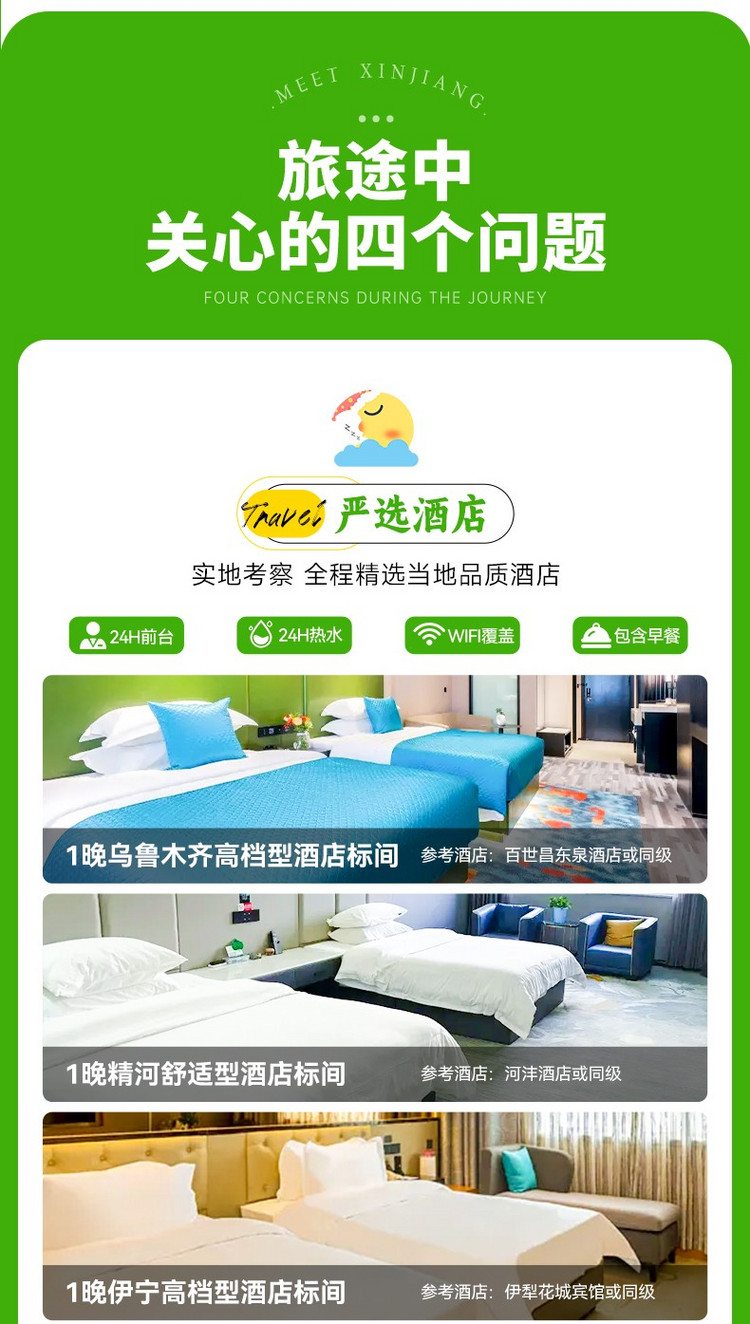 1、交通:乌鲁木齐出发及喀什解散的全程专属用车及司机星级服务(含司机餐补、住宿)