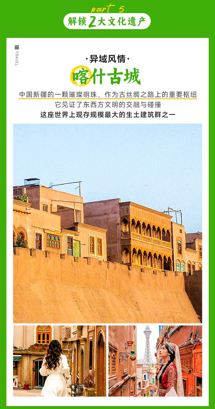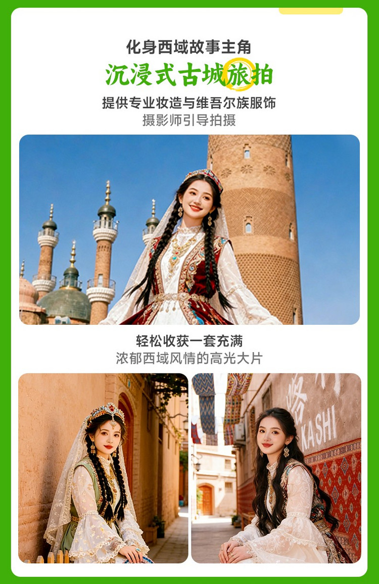 当然,最不能错过的体验是【古城旅拍】。可以换上精美的艾德莱斯绸裙或维吾尔传统服饰,在专业摄影师的镜头下,以古老的街巷、五彩的木门和灿烂的花草为背景,定格您作为“古丽”或“巴郎”的最美瞬间,将这千年风情永久珍藏。
