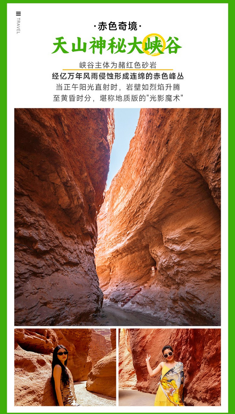 随后,我们抵达今日的核心奇观——【天山神秘大峡谷】(游玩约3小时)。步入峡谷,您便进入了一个由风和流水亿万年前切割而成的红色星球。两侧是百丈高的赤色岩壁,嶙峋怪异,曲径幽深。阳光从缝隙中洒下,在谷内勾勒出变幻莫测的光影,每一步都是全新的视觉冲击,请尽情用镜头捕捉这大自然鬼斧神工的杰作。