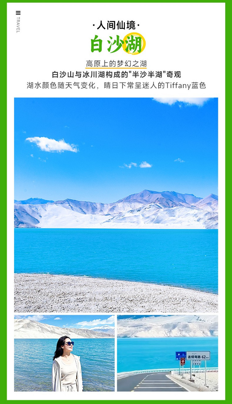 早餐后从【喀什】出发,办理好边防证后,我们便正式向着高原进发。车辆在盖孜峡谷中穿行,两侧是色彩瑰丽的丹霞山壁,当道路前方出现一片纯净的银白世界时,我们便抵达了今日的第一个仙境——【白沙湖】(行程距离:150km,行车时间:约3.5小时;游玩2-3小时)。您会被眼前的景象所震撼:一侧是皑皑如雪的银色沙山,倒映在清澈的湖水中;另一侧则是碧蓝如洗的湖面与远方的雪山交相辉映。这种纯净到极致的美,仿佛将天地间的喧嚣都沉淀了下来。
