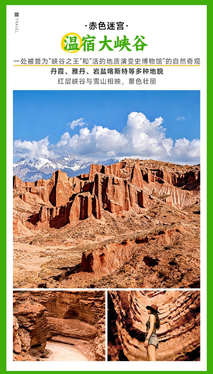 温宿大峡谷气候干热、紫外线极强且风沙较大,务必做好“硬核”防晒(遮阳帽、墨镜、头巾、防晒霜),并备足饮用水。