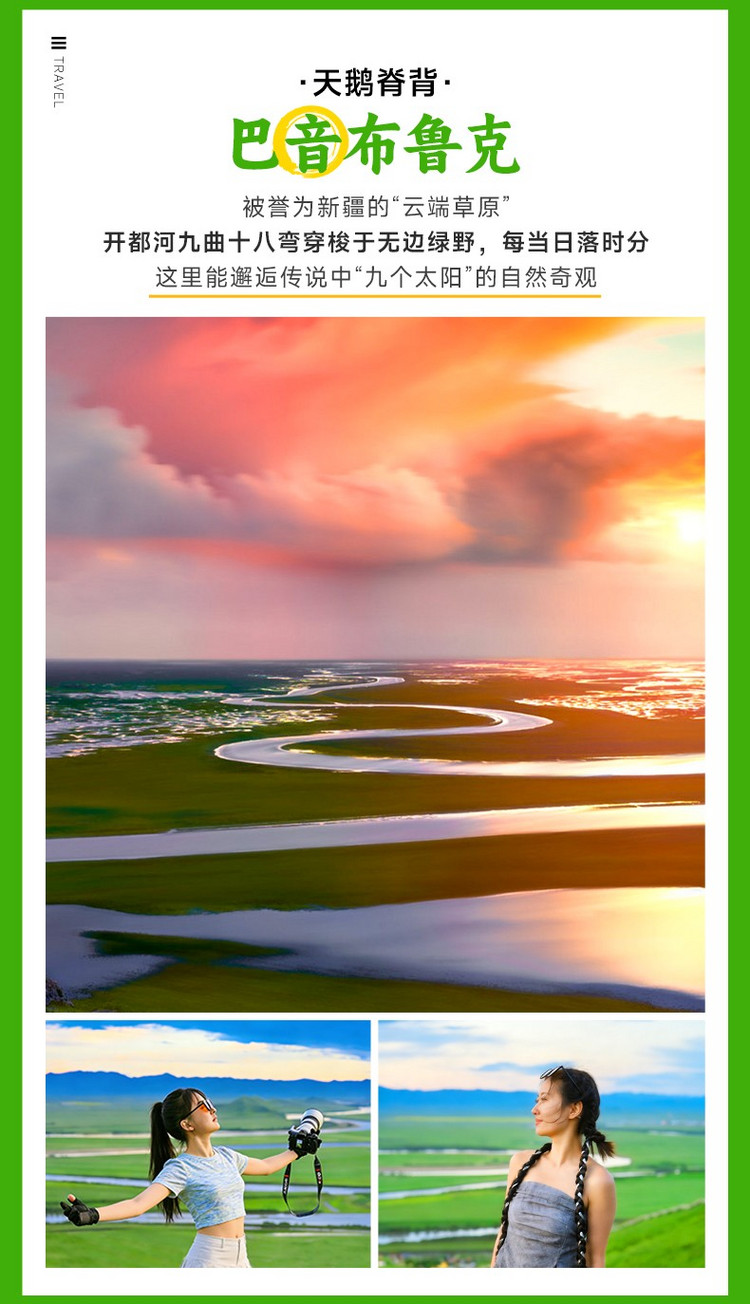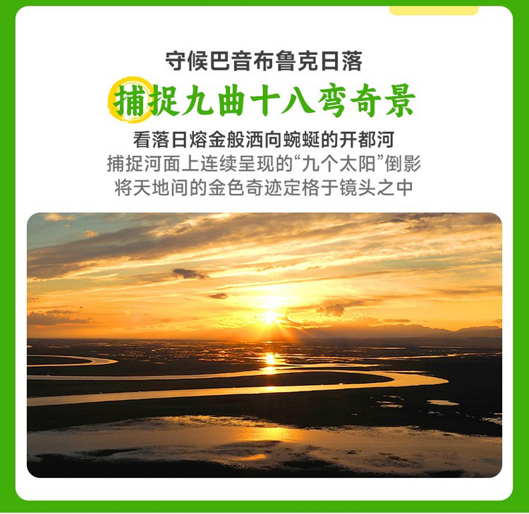 当道路前方出现一望无际的平坦绿野时,我们便抵达了【巴音布鲁克草原】(游玩3-4小时)。随即换乘区间车进入这片天鹅栖息的高原湿地,直奔核心的【九曲十八弯】观景台。请务必做好万全的保暖准备,在黄昏时分守候今日的压轴大戏——当日落西沉,柔和的金光洒向无垠的草海,蜿蜒的开都河如同一条抛落人间的闪亮绸带,在特定时节,还能有幸目睹落日倒影在河曲中勾勒出“九个太阳”的自然奇观。这一刻,天地壮阔,万物静默,所有的等待都被赋予了意义。