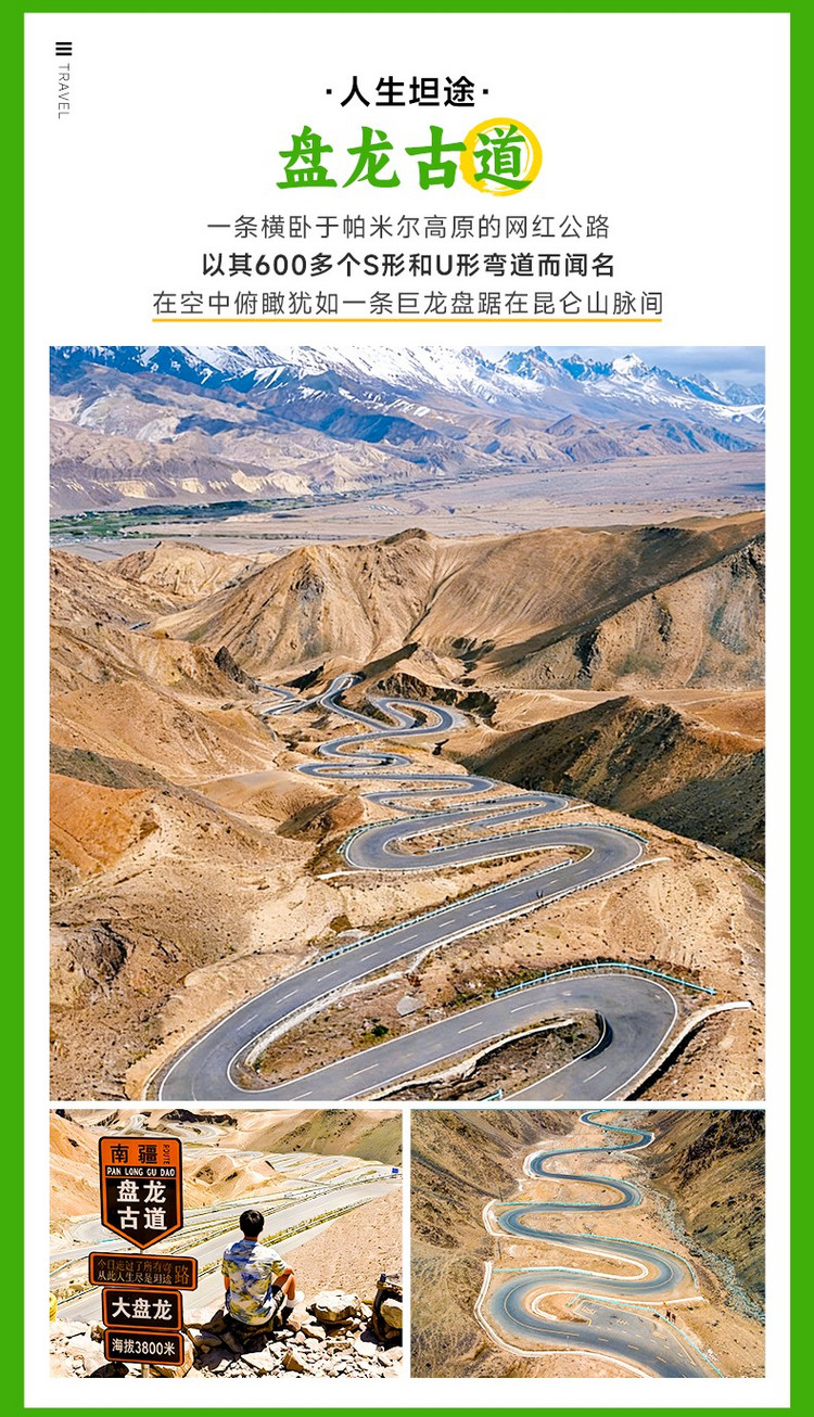 今天,是我们此次帕米尔高原之行的返程与收官之日,也将是充满哲思与回味的一天。早餐后从塔县出发,我们首先前往那条因一句寄语而爆火网络的【盘龙古道】(行程距离:26km,行车时间:约0.5小时)。站在这条拥有超过600个S弯道的黑色柏油巨龙面前,您才能真正体会到何为“鬼斧神工”。我们将在山顶的观景台停留,俯瞰这条巨蟒般蜿蜒盘旋、气势恢宏的天路,并在那块著名的路牌——“今日走完所有弯路,从此人生尽是坦途”前打卡留念,许下对未来的美好祝愿。
