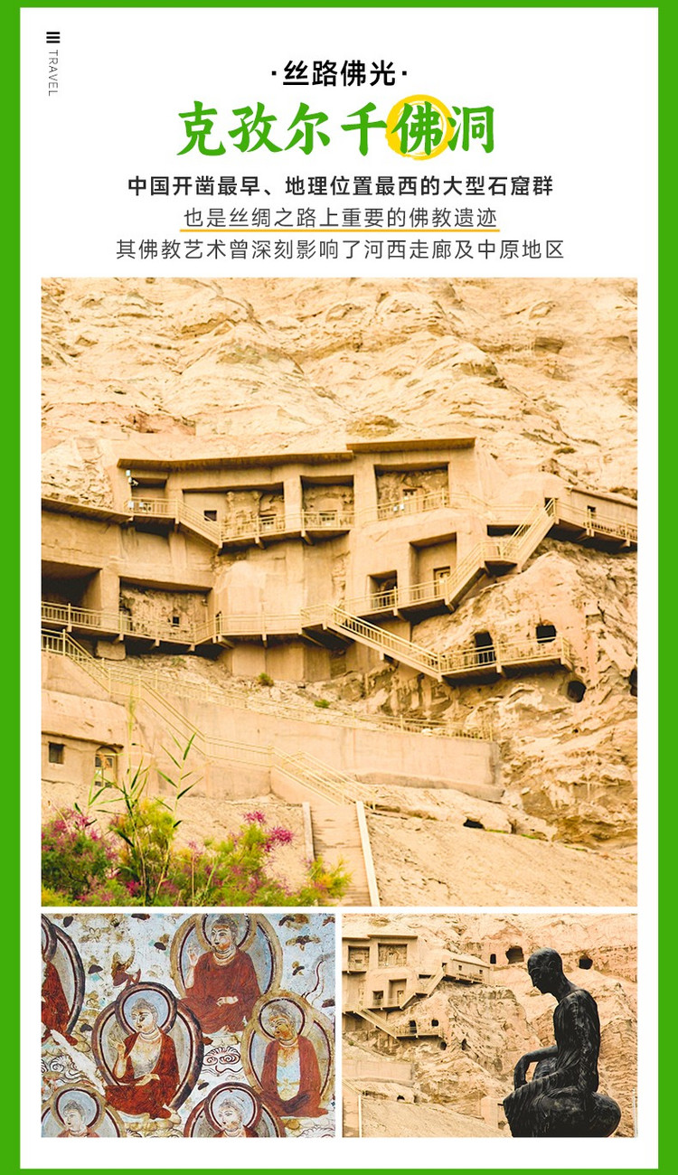早餐后从库车出发,随后便将抵达丝路遗珠——【克孜尔千佛洞】(行程距离:70km,行车时间:约1.5小时,游玩约2-3小时)。作为中国开凿最早、地理位置最西的大型石窟群,它比敦煌莫高窟的历史更为久远。跟随讲解员穿行于一个个洞窟之间,壁画上那些被时光褪去华丽外衣却依然生动的“飞天”与佛本生故事,以及洞窟中央残留的佛座,无不向您静静诉说着古龟兹国曾经的佛教鼎盛与沧桑变迁。请用心感受这份跨越千年的艺术与信仰之力。
