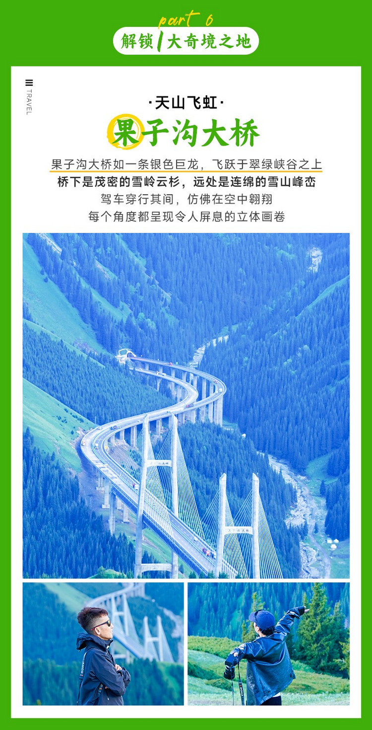 继续前行,前往探寻一座现代工程的奇迹。车辆驶入果子沟峡谷,层峦叠翠的森林令人目不暇接。我们会找到一个绝佳的【果子沟大桥观景悬崖机位】(行程距离:98km,行车时间:约1.5小时,游玩0.5小时)。站在观景台,凭栏远眺,宏伟的果子沟大桥如一条钢铁巨龙,横跨在险峻的峡谷之上,与周围壮丽的自然风光完美融合,展现出力与美的极致结合。