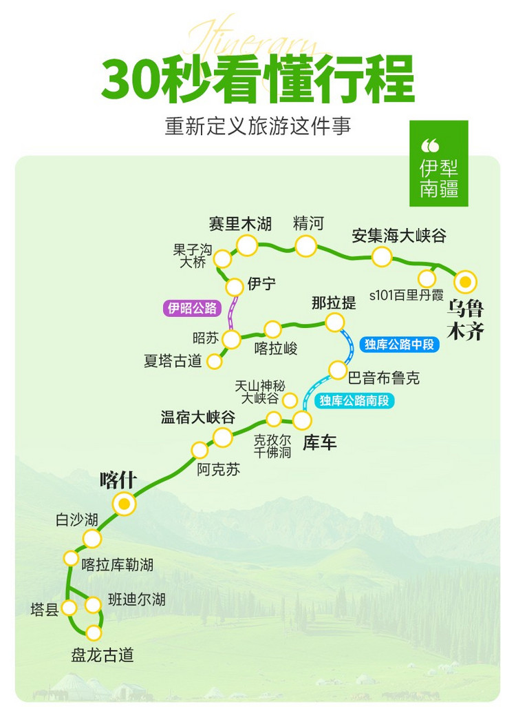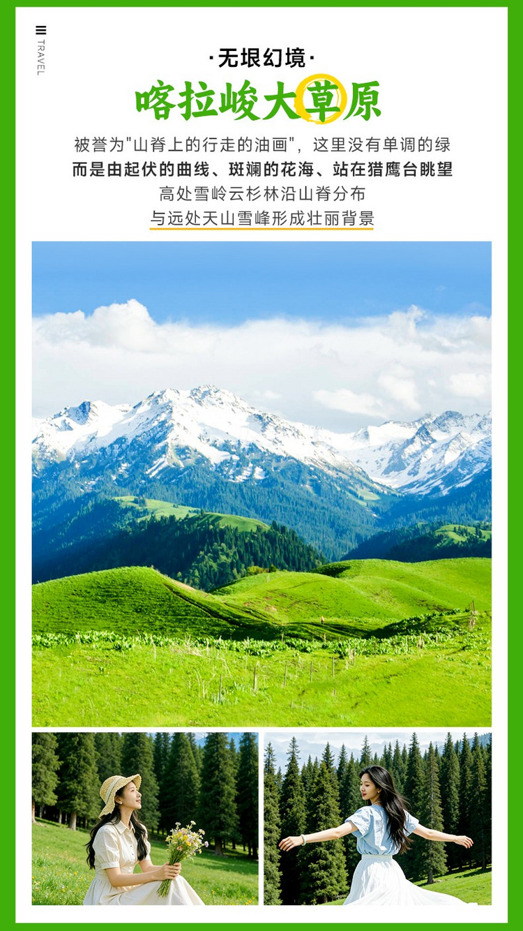 今天,我们将暂别城市的喧嚣,驶向天山最壮丽的角落,去叩响一条承载着千年历史的史诗之门。早餐后从伊宁出发,我们计划沿被誉为“小独库”的【伊昭公路】前行(行程距离:122km,行车时间:约3小时,边走边玩)。(请注意:若伊昭公路因天气或政策原因未开通,我们将按原路绕行特克斯,虽路程稍长,但安全第一。)(若伊昭公路开通) 这条“小独库”将为我们带来另一场视觉盛宴。车辆在蜿蜒的盘山路上爬升,翻越海拔3000多米的安格列特达坂,沿途的白石峰嶙峋陡峭,山涧的牧场绿意盎然,景色险峻而旖旎,丝毫不逊于独库公路。