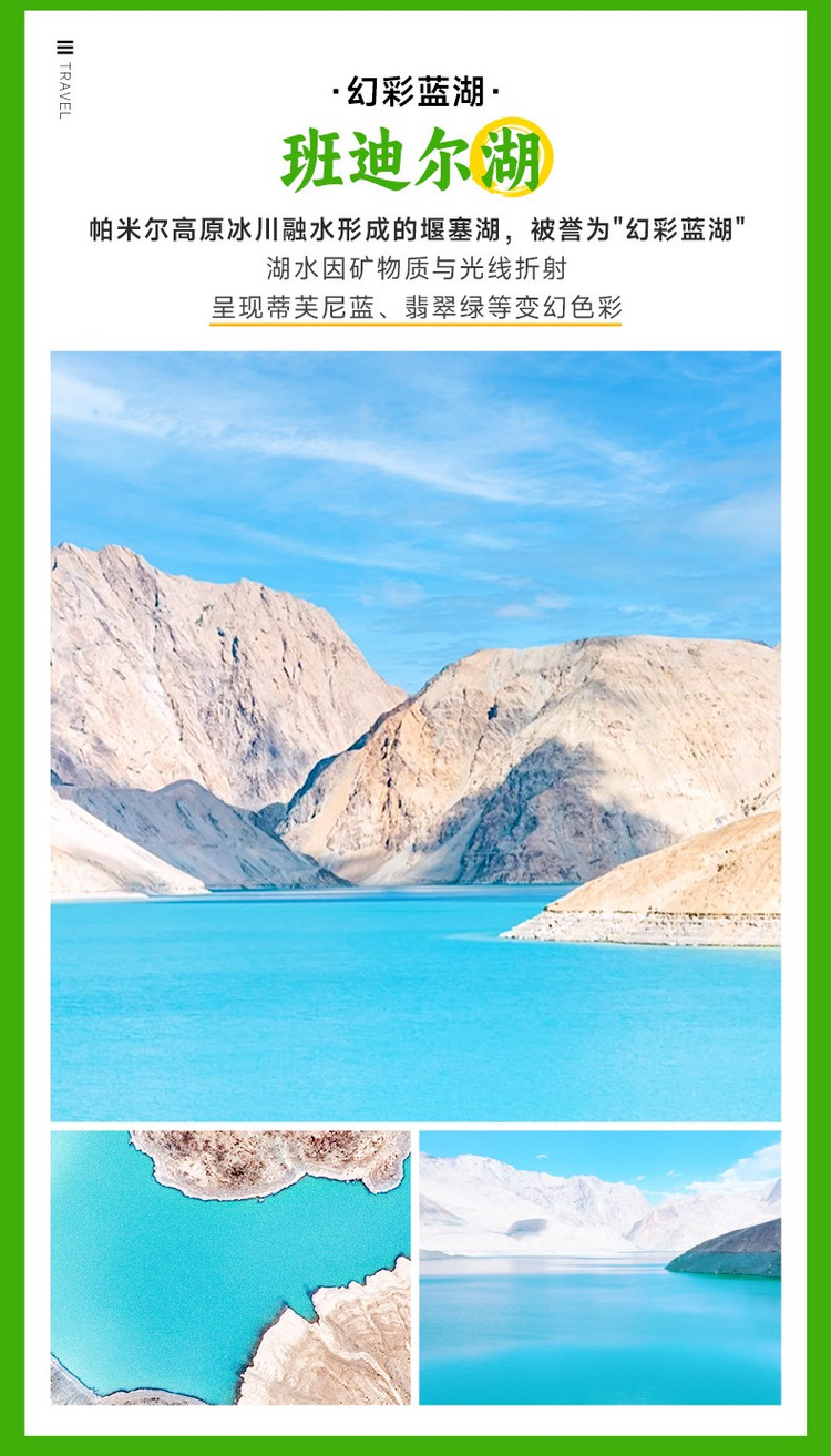 带着这份豁达的心情,我们驶向被誉为“帕米尔高原最蓝的眼泪”——【班迪尔湖】(又称下坂地水库)(行程距离:30km,行车时间:约1小时;游玩1小时)。它的湖水呈现出一种变幻莫测的蓝,在阳光和周围土林的映衬下,时而蒂芙尼蓝,时而碧绿,时而又深邃如墨。这片静谧而绝美的湖光山色,与盘龙古道的惊险刺激形成鲜明对比,为我们的高原之旅画上一个宁静而悠远的句号。