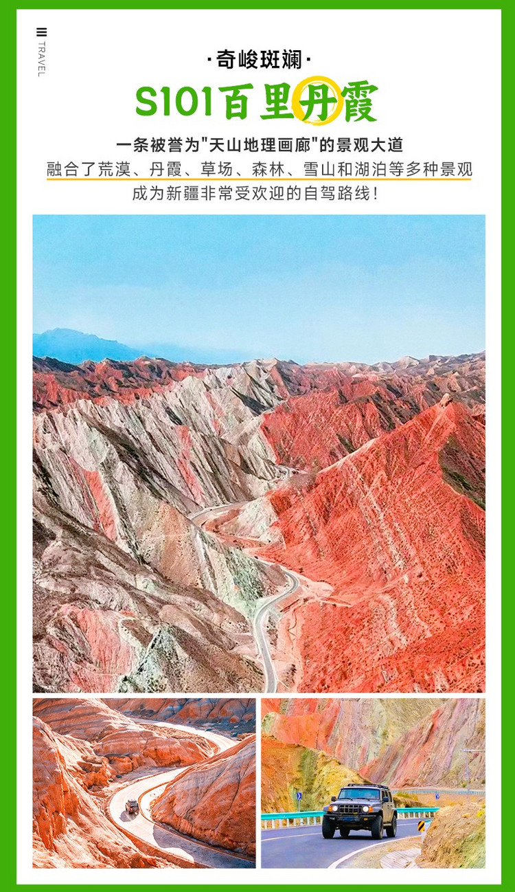 今天,我们将暂别常规路线,踏上一条被誉为“天山地理画廊”的秘境之路,感受色彩与裂缝交织的视觉冲击。早餐后从【乌鲁木齐】(行程距离:30km,行车时间:约0.5小时)出发,我们驶向小众而绝美的【S101省道百里丹霞景观带】(行程距离:300km,行车时间:约5小时,边走边玩)。这条曾经的国防公路,如今是摄影家和自驾爱好者的私藏宝地。车辆在连绵的彩色山峦中穿行,窗外的景色如同打翻的调色盘——赭红、青灰、明黄、黛紫……各种色彩在阳光的照耀下交织变幻,构成一幅长达百里的天然丹霞画卷。我们会在沿途最佳的观景台停留,让您近距离感受这片媲美张掖,却更显原始野性的壮丽景观。