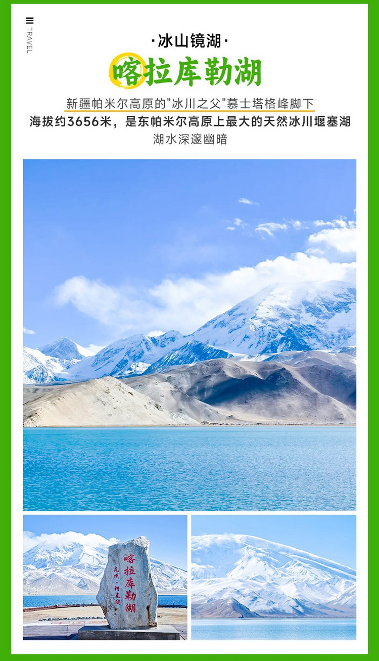 依依不舍地离开白沙湖,我们继续前行约半小时,便抵达【喀拉库勒湖】(行程距离:48km,行车时间:约30min;游玩1小时)。这里是我们与“冰山之父”——【慕士塔格峰】最近距离的邂逅。巨大的雪峰完整地倒映在如镜面般的湖水中,形成一幅绝美的对称画卷。您可以在湖畔漫步,静静感受海拔7509米的慕士塔格峰所带来的庄严与圣洁。