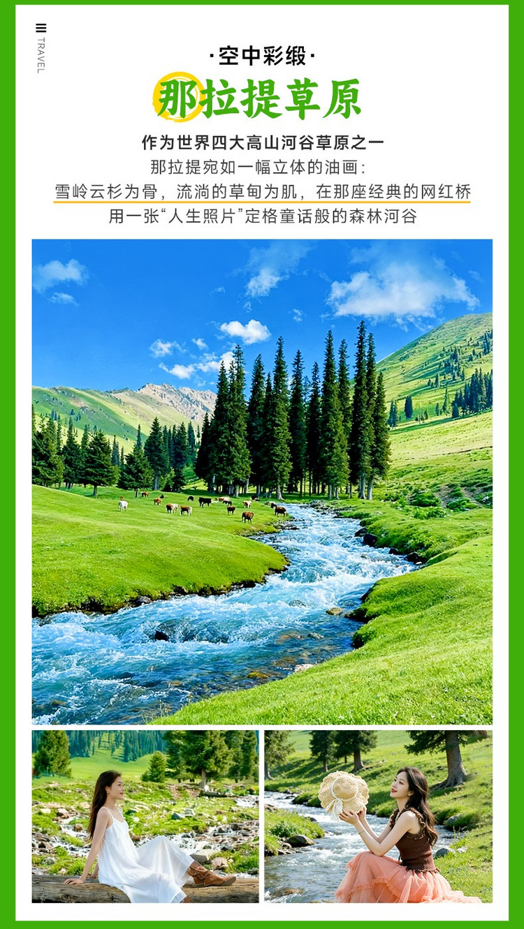 午后,我们怀着不舍的心情,开启漫长的车程,前往下一个草原传奇的所在地——【那拉提镇】(行程距离:290km,行车时间:约4小时)。这虽是一段不短的路程,但窗外的景色从特克斯河谷的田园风光,逐渐过渡到巩乃斯河谷的丰美绿意,本身就是一场流动的风景片。当晚抵达那拉提镇并办理入住,为明日探索那拉提空中草原养精蓄锐。