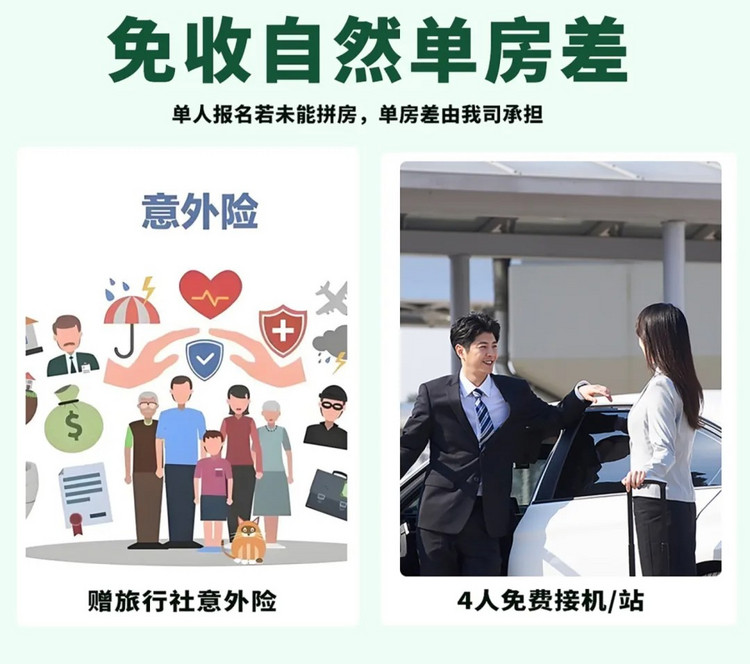 5、【单人房差】春节期间1200元,平常900元(行程住宿按照双人标准间安排,单人报名拼房不成,单房差由我司承担,如队员个人要求单住则需补齐房差!)