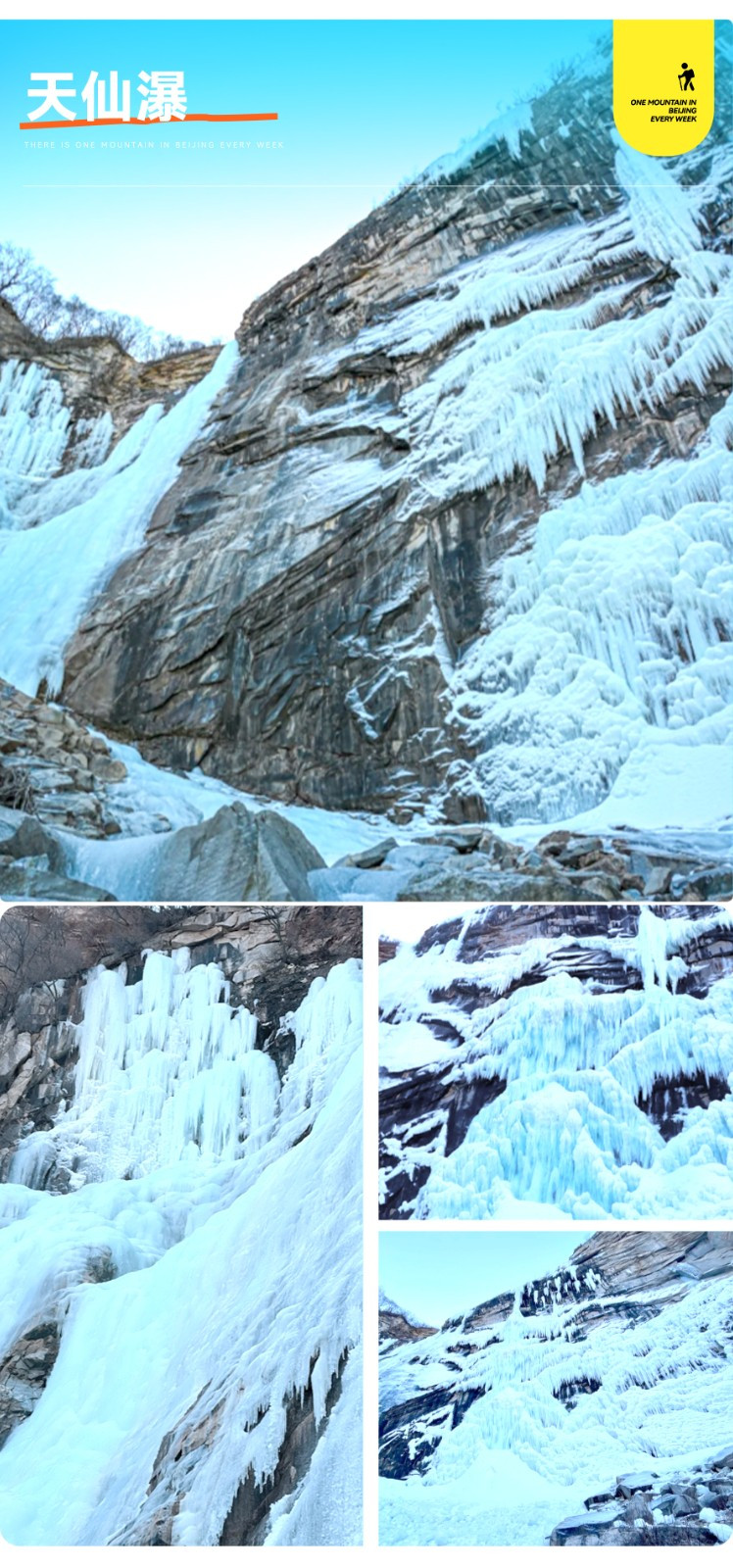 天仙瀑,位于密云区石城乡境内的白河上游、云蒙山北麓。由著名的接仙瀑、惊仙瀑和望仙瀑的三叠瀑布组成,总落差310米,大大超过庐山三叠泉,是我国已知最高叠瀑。飞瀑流泉多,其中主沟上有七处:望仙瀑、惊仙瀑、聚仙瀑、拜仙瀑、接仙瀑、醉仙瀑、断崖三瀑;支沟上有隐仙瀑、卧仙瀑、迷仙瀑。仙瀑溪不仅飞瀑荟萃,而且十分雄险、奇特,大部分瀑布落差均在20米以上,望仙瀑高达60米,惊仙瀑高达115米,是华北落差最高的瀑布。冬季天仙瀑冰瀑的美是难以言表的,任何语言的描述都显得苍白。往日流水潺潺的河溪凝结成洁白的“玉带”在山间舞动,更有宽阔的巨型冰瀑高悬在崖壁之上,让人感叹大自然的鬼斧神工。