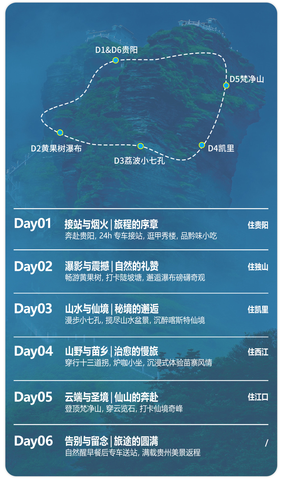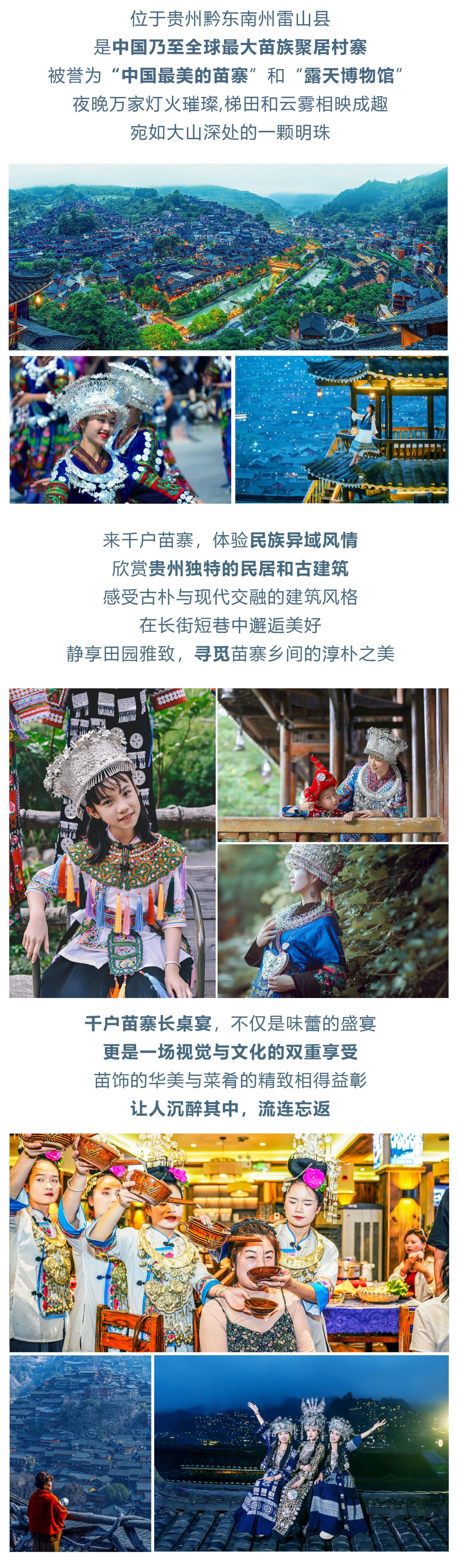 酒店早餐后,开启一天的人文与自然结合之旅。早上前往【炉咖】沿途经过凯里的“网红”公路--凯里十三道拐。香炉山是一处小众原生态秘境,远离城市喧嚣,保留着最原始的乡村风貌,在炉咖喝一杯清香的咖啡,感受乡村的慢节奏。结束后乘车前往【西江千户苗寨】漫步在青石板路上,看错落有致的苗族吊脚楼,可参观苗族文化博物馆,了解苗族的历史、文化、习俗,感受苗族文化的深厚底蕴