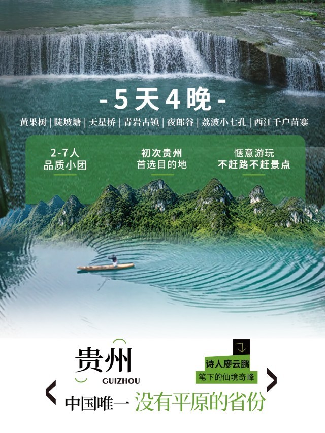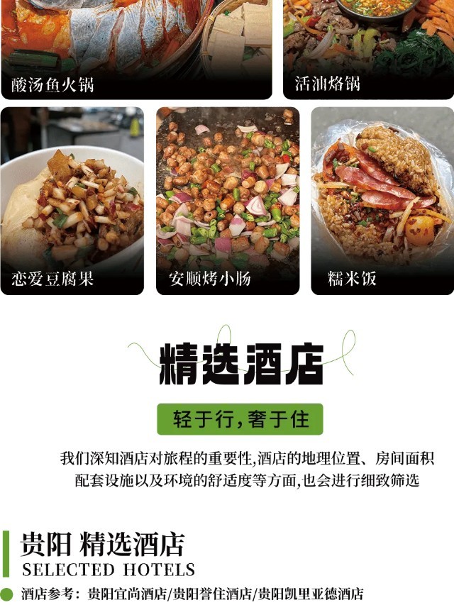 其他:费用包含所未提及的任何形式消费(如:黄果树景区扶梯索道、小七孔鸳鸯湖划船、西江苗寨商业演出、青岩古镇景交车以及古镇内小景点等可自由选择消费项目)