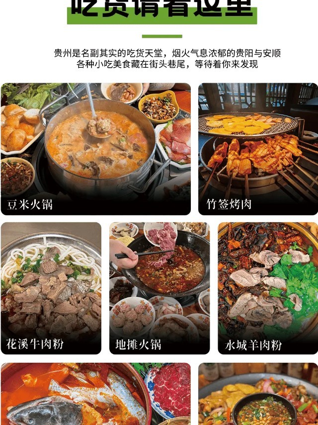 ② 美食推荐:青岩猪脚、豆腐丸子、糕粑稀饭、独山虾酸、荔波豆花烤鱼、佳荣生态牛肉火锅;
