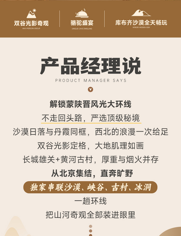 注:骑骆驼、越野车、滑沙均为自费项目,自愿选择参加。