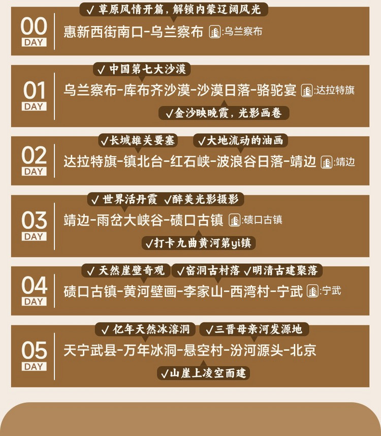 19:00我们在地铁5/10号线换乘惠新西街南口C口集合出发,请勿迟到,前往乌兰察布(车程约4.5小时);