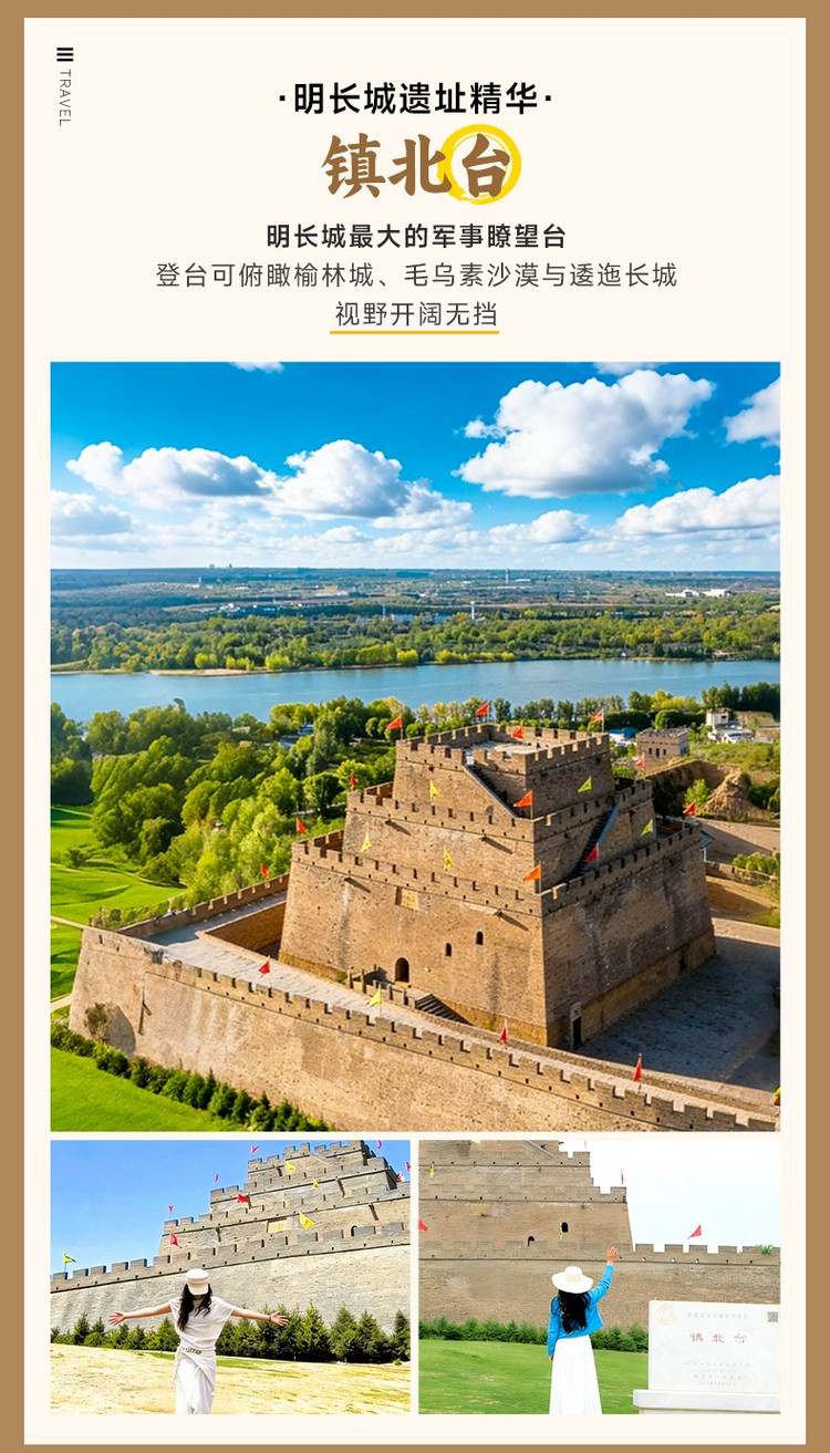 【镇北台】(游览时间约1小时)这可是明代长城遗址中最为宏大、气势最为磅礴的建筑物之一,素有中国长城“三大奇观之一(东有山海关、中有镇北台、西有嘉峪关)”,这当中,镇北台最为低调,却在历史上以及现代有着极高的地位。镇北台据险临下,控南北之咽喉,如巨锁扼边关要隘,在历史上承担着至关重要的使命。同时也是现存长城遗址中最为宏大、气势最为磅礴的要塞之一 。站在镇北台的城楼上眺望四周的山河地貌,不禁心中感慨万千!
