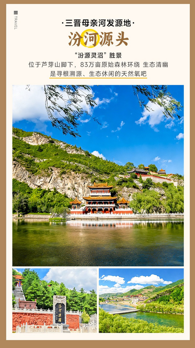 ·【汾河源头】汾河源头是三晋人民饮水思源、寻根感恩的母亲河。汾源四周九山汇聚,溪流淙淙,亭台楼榭,风光旖旎。源头有一水塘,塘上石壁刻有“汾源灵沼”四个大字,壁上雕有一个龙头,龙口中喷出一股清泉,终年流淌不绝。雷鸣寺、魁星阁挺立楼子山上,沾汾河之灵气,气象不凡。自古以来就有三晋第一胜境之美誉。