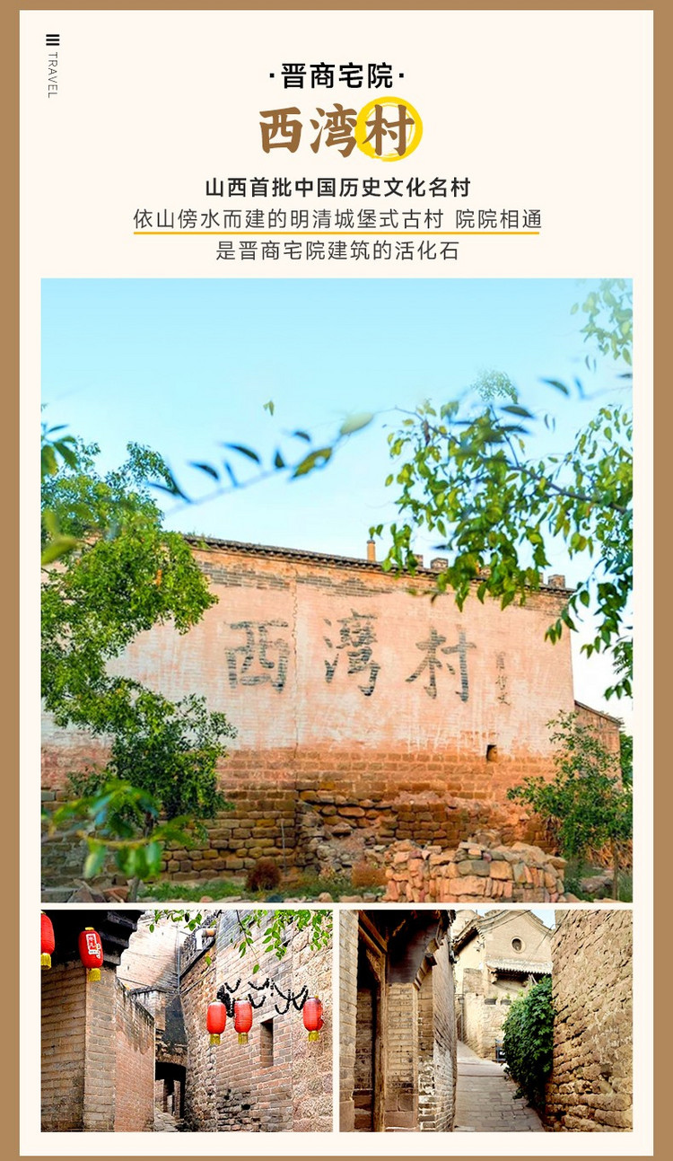 随后驱车仅3公里便抵达【西湾村】,同样是中国历史文化名村,为晋商陈氏家族聚居地,村内四十余座宅院依山而建,五巷纵横、院院相连,形成封闭又精巧的城堡式格局,砖雕、木雕、石雕工艺精湛,院落布局暗藏晋商家风,被誉为“黄土高原上的乔家大院”,细细游览精致的古宅巷道,感受晋商民居的建筑智慧,游玩约1小时;