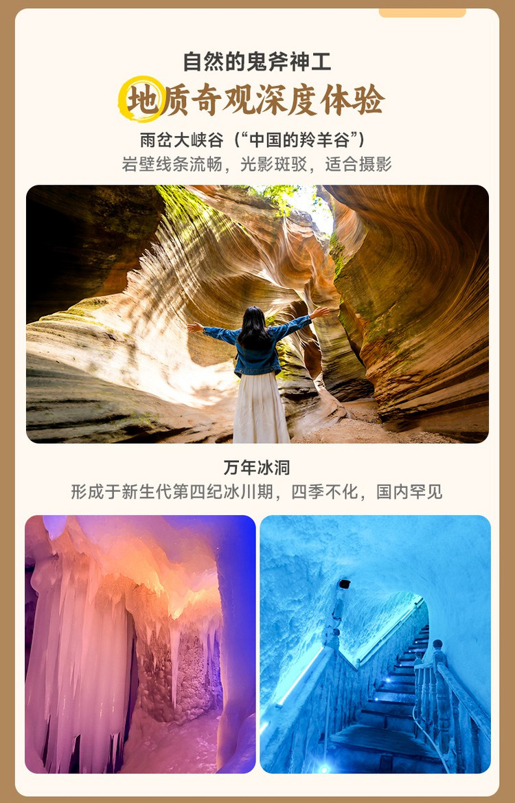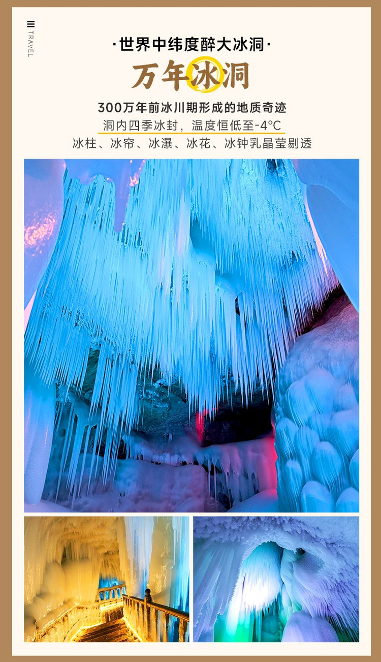 ·【万年冰洞】冰洞的形成原因至今仍是个迷,距这里不远的地方还有一座“火山”,我们在来的途中就能看到“冰火两重天”的奇景!这里分为五层,我们通过钻冰洞、下冰梯、过冰栈来游览这里,眼睛所看到的是厚厚的冰层,如剑般的冰柱、仿佛倾泻而下的冰瀑,还有冰床、冰花、冰帘等等,在彩灯的映衬下更显得神秘。