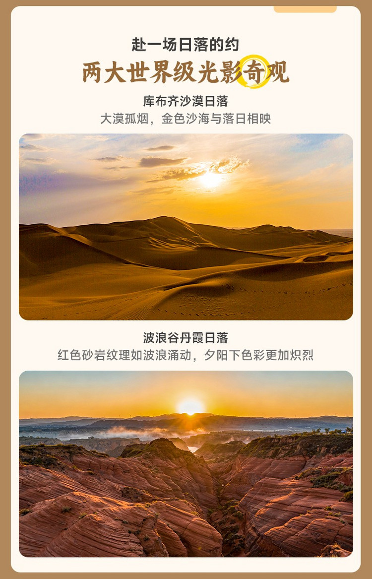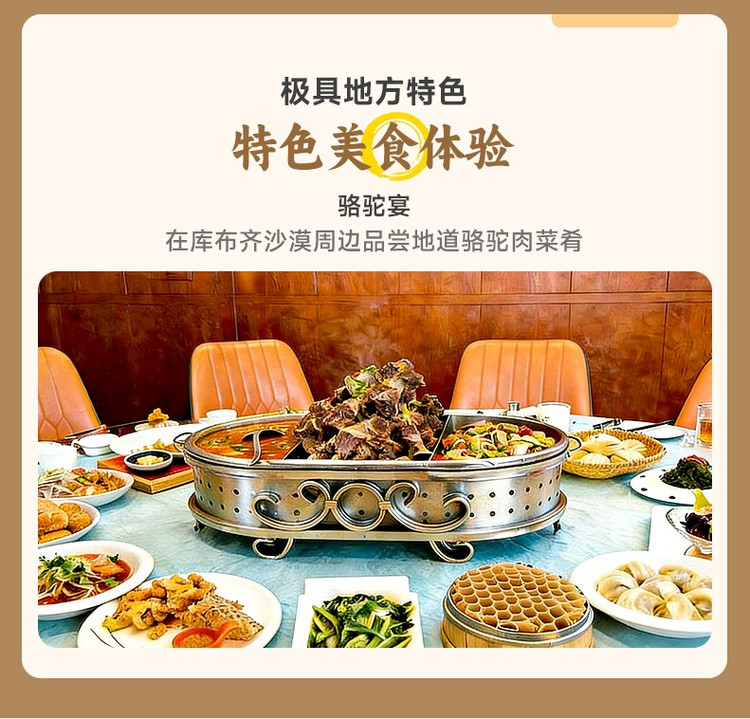 抵达【库布齐沙漠】后,我们乘坐吉尼斯纪录的穿沙缆车进入沙漠,您可以选择沙漠徒步,自在探索,同时有多种娱乐项目可以自愿选择:可以体验骑骆驼,感受驼铃铛铛!也可以刺激一把,感受一下沙漠越野车,在沙漠里尽情狂野,享受年轻气盛的感觉。还有滑沙,全方位接受细沙的抚摸,在沙漠里撒泼打滚,尽情玩耍,忘记你的年纪,忘记你的身份,这才是旅行的快乐!