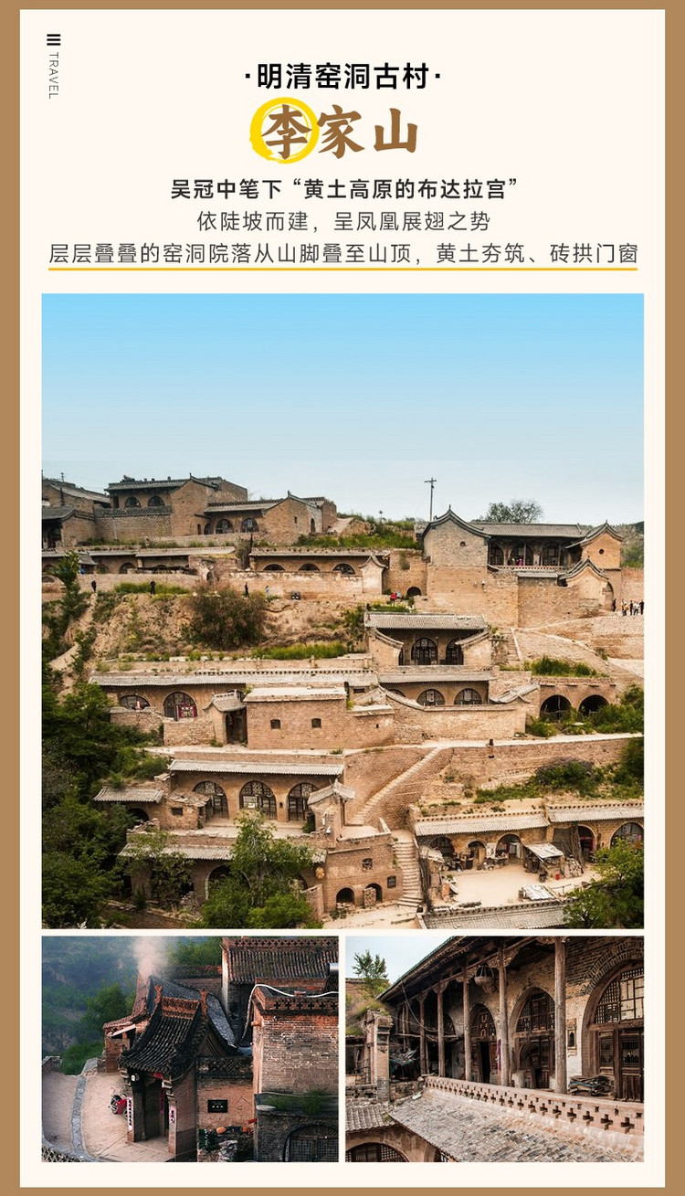 结束壁画游览后,乘车前往【李家山村】,这座古村是吴冠中笔下“黄土高原的布达拉宫”,也是中国历史文化名村,明清时期李氏族人依70度陡坡而建,百余座窑洞院落层层叠叠、从山脚铺至山顶,形似展翅凤凰,黄土夯筑的民居与精巧的砖木雕刻相映成趣,原生态的村落风貌尽显黄土高原的质朴与震撼,漫步石阶巷道,探访古院民居,沉浸式感受这份与世隔绝的烟火气,游玩时长约2小时;