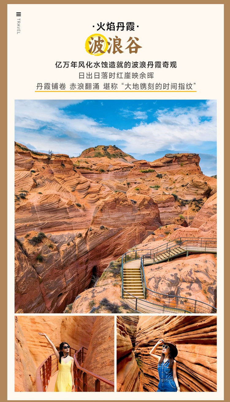 行程中我们将徒步波浪谷,大家可以漫游在原始山路,亲手去抚摸这时间的纹理。如果天气好,傍晚时分还可以在波浪谷拍摄日落。晚霞与波浪谷交相辉映,美艳不可方物。特别注意,丹霞地貌脆弱,请一定不要雕刻破坏,尽少留痕,保护大自然的杰作。天地壮阔,山河奇丽,此时此景,我们唱一曲激扬的信天游,将自己深深融入此情此景之中,该是怎样的视听盛宴!