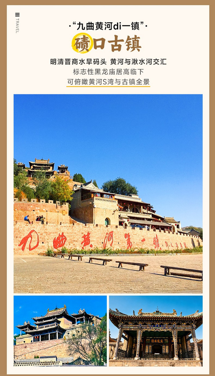 尽兴游玩后,我们集合乘车前往【碛口古镇】,碛口位于黄河晋陕峡谷中部,黄河由北而来,湫水从东而至,卧虎山横亘镇北,黑龙庙雄峙河东,山环水抱,阴阳交会,山的气势,河的雄浑,凝成了“虎啸黄河,龙吟碛口”的壮丽图景。这也是中国北方著名的商阜重镇,称谓“水旱码头小都会,九曲黄河di一镇”。碛口古镇素有“九曲黄河第一镇”美誉,是明清时期黄河水运的黄金水旱码头,作为中国历史文化名镇,这里留存着成片明清商铺、票号、镖局旧址,青石板路蜿蜒交错,黑龙庙矗立在古镇制高点,既能俯瞰黄河S型弯道的壮阔,也能感受昔日晋商商贸的繁华余韵。