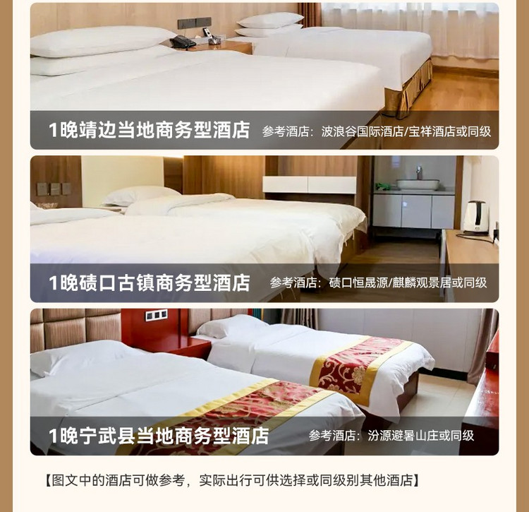 4、门票:银肯塔拉门票+缆车+摆渡车、雨岔大峡谷首道门票+景交车、波浪谷首道门票、镇北台首道门票、红石峡首道门票、芦芽山北线套票