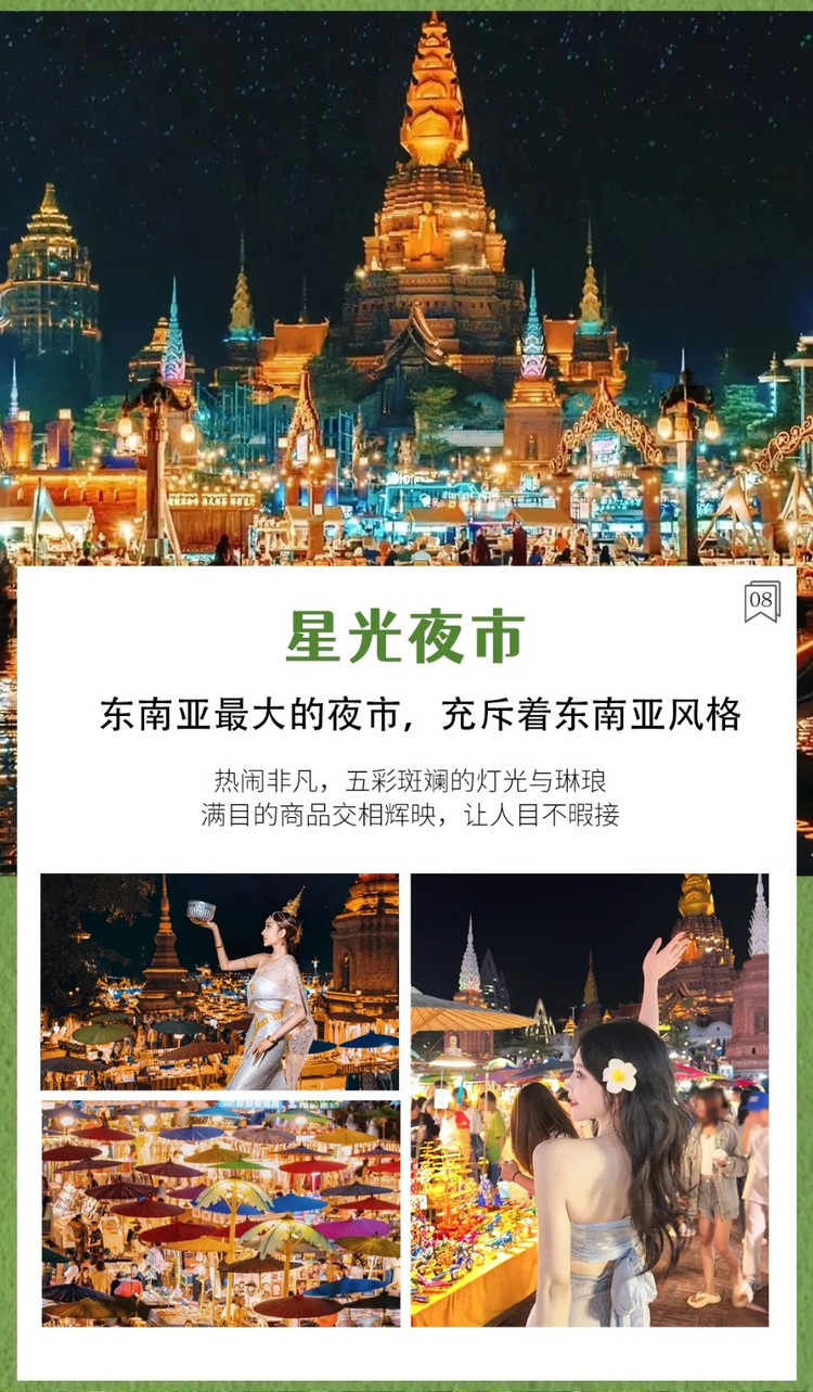 晚上继续住告庄。自由闲逛大金塔和湄公河星光夜市,感受这异域风情,这里的六国水上市场也一带要去逛一下哦,完全会让你感觉到了泰国啦!也可以自由拍摄一组版纳写真,在版纳为妃做傣,当一回在逃公主。