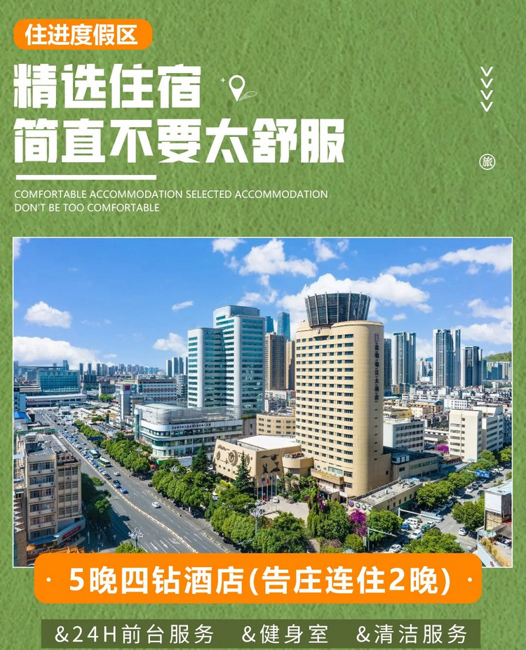 昆明市四钻酒店一晚、 普洱市四钻酒店一晚、景迈山景区农家客栈一晚、告庄四钻酒店二晚、景洪市区四钻酒店一晚;