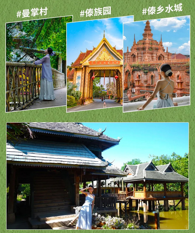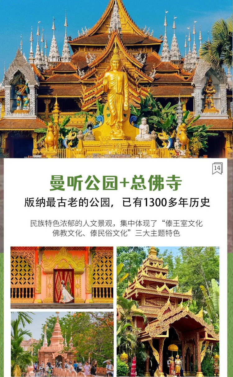 早晨后来到澜沧江对岸的【曼听公园】,这里被誉为“傣王的后花园”。传说傣王妃来游玩时,这里的美丽景色吸引了王妃的灵魂,因而得名。来这里你仿佛置身泰国,除了环境优美,还有各类精美的佛塔佛寺以及动物们的互动表演。随后便是【总佛寺】,这可能是你见过的最像置身于东南亚的寺庙,建筑大气雄伟,金碧辉煌,一角一处都各不相同,雕刻精美的梁柱,让人看着都是一种享受。手机随手一拍都堪比国外大片,这里往往是您出境出片的不错的选择。