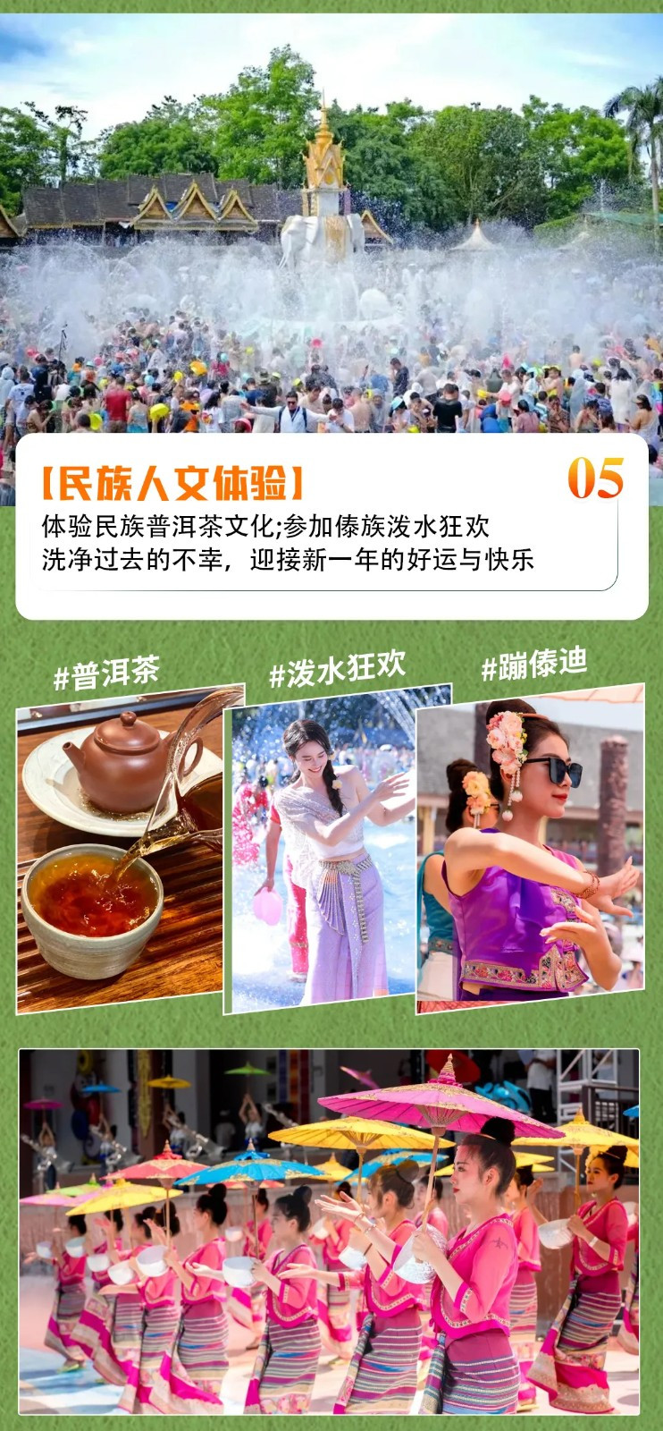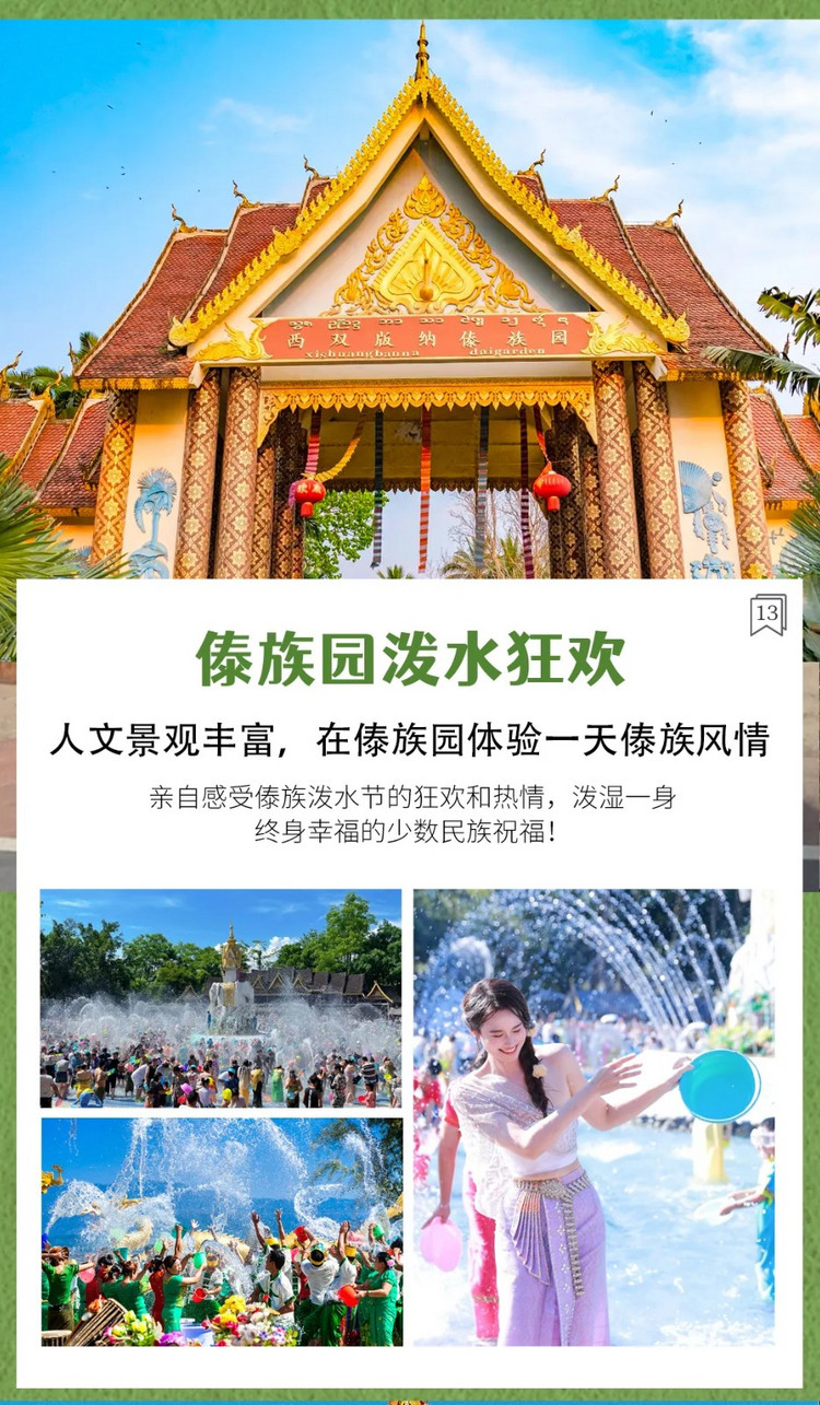 随后我们前往【傣族风情园】,几个傣族村寨连片,家家户户门前屋后也都种满了各种蔬菜水果,可以在门口的商贩里租盆子(自费),请一定带一套干净的衣服+毛巾+拖鞋(也可以在傣族园租傣族服饰泼水)。参加【天天欢度泼水节】的壮观场面,泼水狂欢咯,亲自感受傣族泼水节的狂欢和热情,泼湿一身,终身幸福的少数民族祝福!还可以蹦傣迪,气氛炸裂,嗨翻全场。泼水狂欢结束后,晚上入住景洪市区!