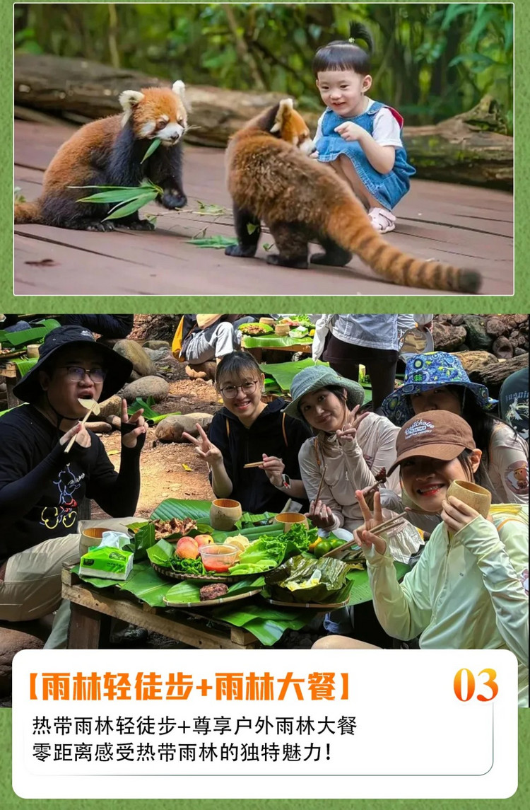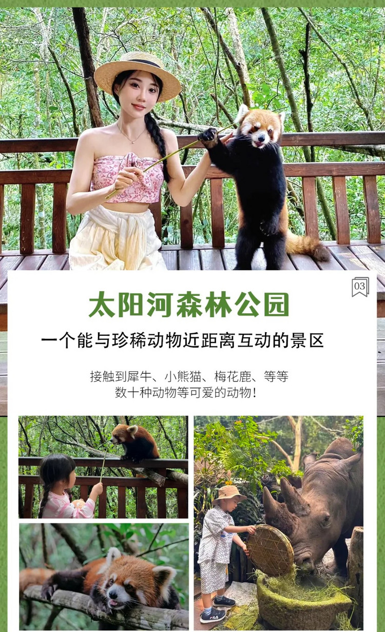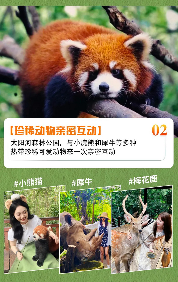 早餐后前往【太阳河国家森林公园】,乘坐电瓶车进入森林,森林里有各种各样被称为“活化石”珍贵植被和珍稀动物,这里被誉为“北回归线上最大的绿洲”。2800多种动植物在这里共生,还是国内唯一的一个能与众多动物近距离互动的景区,还可以接触到犀牛、小熊猫、梅花鹿、猕猴、白颊长臂猿、灰鹤、白鹭、黑熊等等数十种动物等可爱的动物!这里是一个生物多样性显著的森林公园。