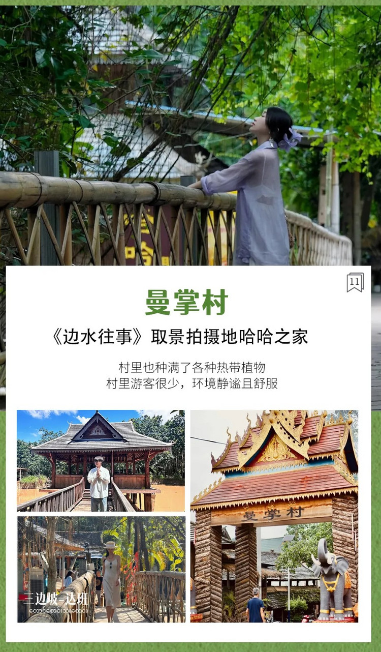 游玩结束后前往热播剧《边水往事》取景拍摄地—【曼掌村】,打卡主要拍摄地点—曼掌村哈哈之家。观赏傣族传统建筑以及热带植物,周围被茂密的热带雨林环绕,村里也种满了各种热带植物,村里游客很少,环境静谧且舒服,在村里可以自费参与非遗文化体验:制作傣陶、造纸等。