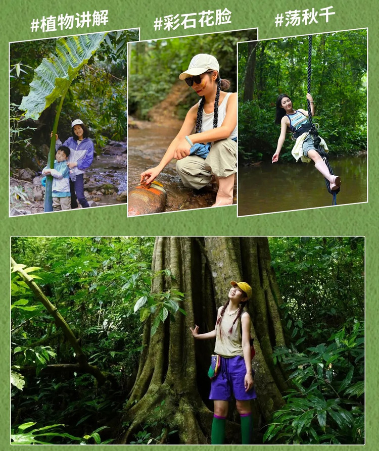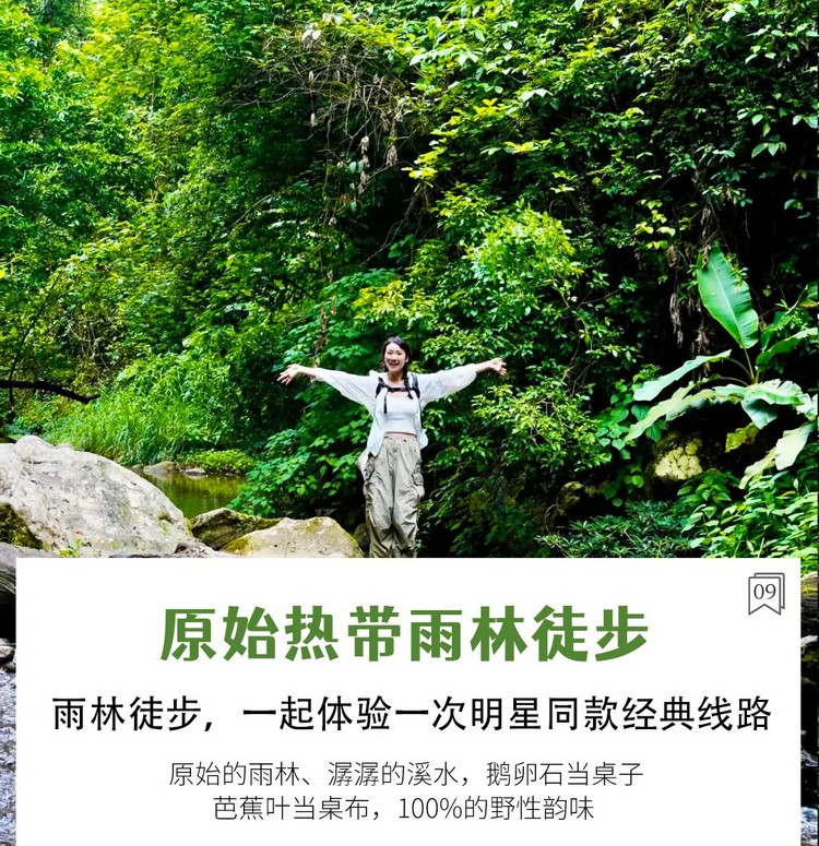 早餐后前往一片已开发好的热带雨林,一起体验一次明星同款经典线路,体验特色【原始雨林徒步穿越】。这里更原始、更多样、更体验,更安全!溜索、彩石花脸、荡秋千、植物讲解,您都将体验到,中途更是享用特色【野外雨林大餐】,原始的雨林、潺潺的溪水,鹅卵石当桌子、芭蕉叶当桌布,100%的野性韵味。