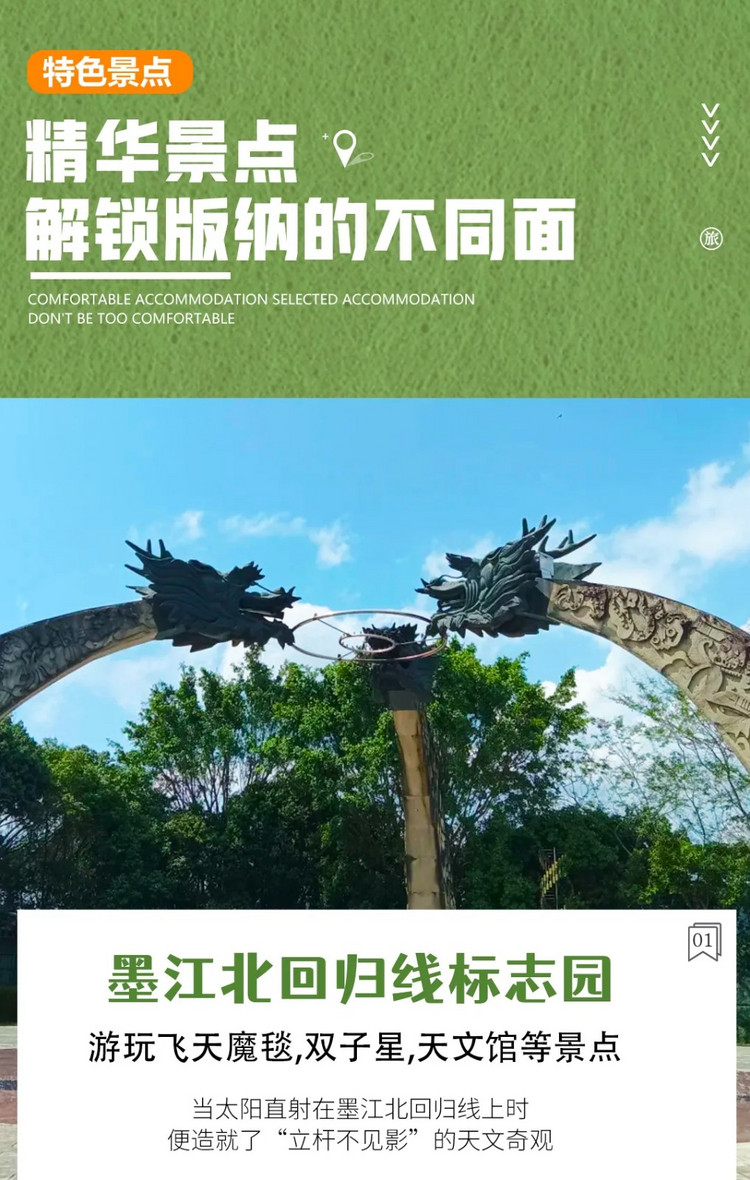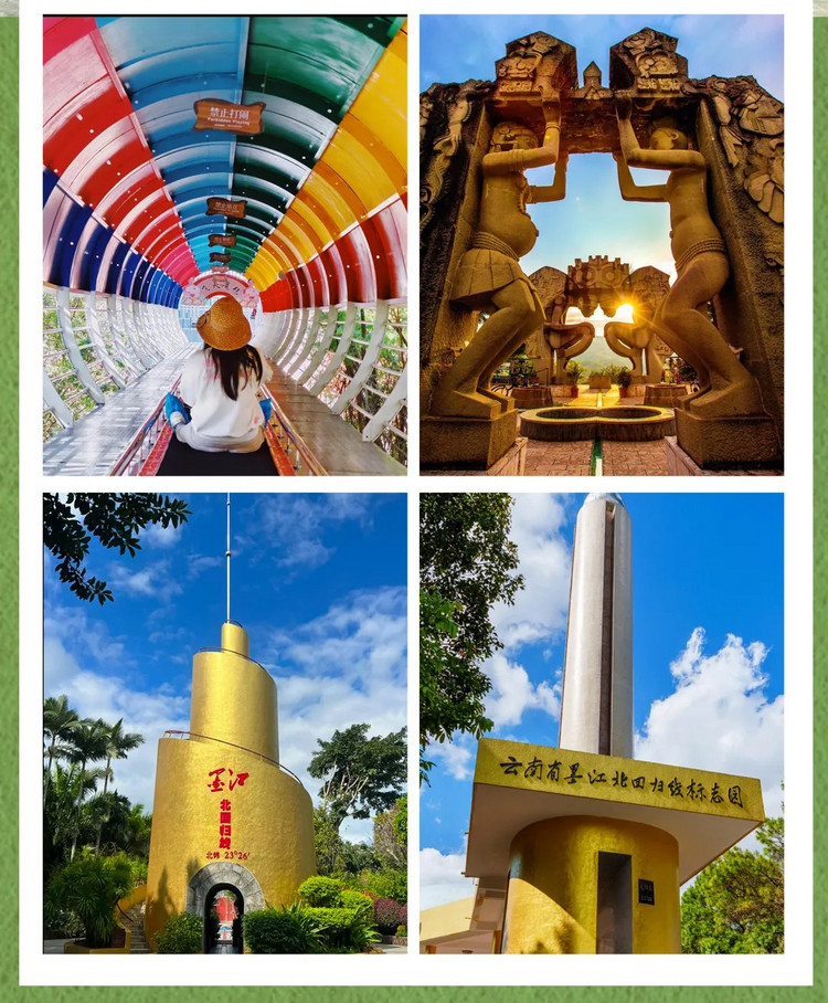 2、行程所列景点及门票:那柯里,墨江北回归线标志园+上行魔毯,普洱太阳河森林公园门票+电瓶车,景迈山、景真八角亭、般若寺、傣乡水城、中科院植物园,野象谷,西双版纳热带雨林,傣族园+电瓶车,曼听公园+总佛寺;
