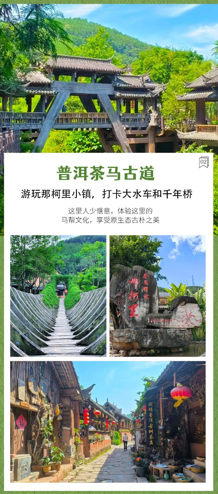 早餐后出发,先到达双胞胎之乡—【墨江】,游览【北回归线标志园】,太阳转身的地方,一个充满神秘色彩的地方,当太阳直射在墨江北回归线上时,便造就了“立杆不见影”的天文奇观。 游玩【飞天魔毯】(单程)、【双子星】、【主标志塔】、【天文馆】等景点,结束后前往普洱市宁洱县。来到【那柯里】小镇,它是茶马古道上的一个重要驿站。这里人少惬意,打卡【大水车】和【千年桥】,以及古茶马驿道,体验这里的马帮文化好原生态古朴之美。