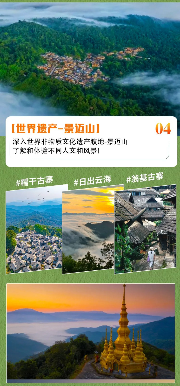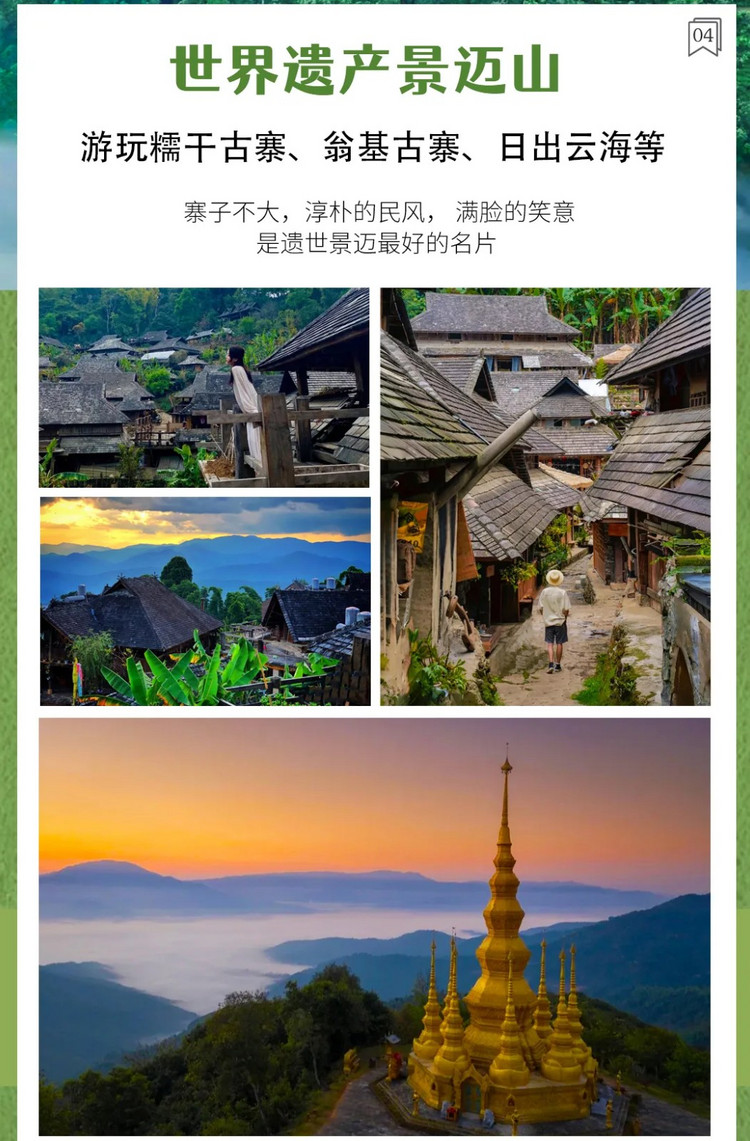 游玩结束后继续往前,来到【景迈山】,这里不仅有2000年种茶历史文化, 更有14个少数民族交融的古村落。 每个寨子不大, 家家户户都在晒茶烤茶, 世世代代生活在这片山坳里的人们, 淳朴的民风, 满脸的笑意, 这应该是遗世景迈最好的名片。我们深入傣族古寨【糯干古寨】。世人只知景迈布朗,但不知道在景迈深处还藏着一个更为古朴原始的傣寨。电影《一点就到家》的取景地之一, 傣族文化的原始古村落。 踏着石阶漫步,阳光透过热带植物的树叶洒在地面上 ,当地婆婆们在路边用炭火烤着土鸡,炊烟袅袅。晚上我们便住进山上景区民宿或客栈,零距离感受山上古寨的清幽与寂静。