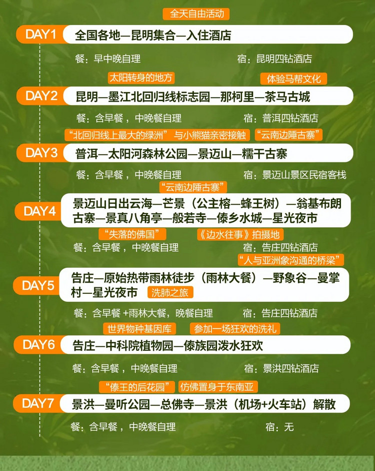 1、全国各地往返昆明和景洪的大交通,自行选择交通工具到昆明集合,从景洪解散;