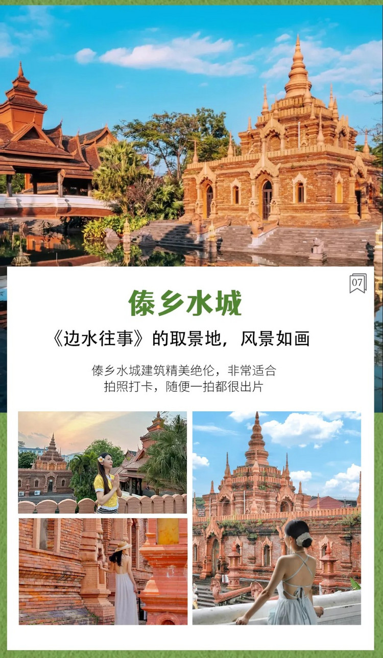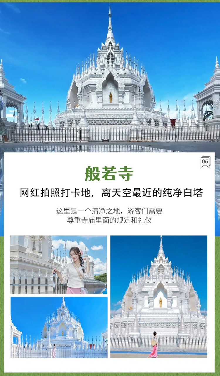 游玩结束后,约1.5小时车程后,来到版纳州府-景洪。我们先来到云端之上,相遇千年古刹。来到一处拍照网红之地—【般若寺】,独特的美与众不同,珍珠那种光泽的白,神圣纯净,银光闪闪。您可以在这里定格一张自己的人生图片。随后前往《边水往事》的另一取景地【傣乡水城】,傣乡水城有着独特的傣族建筑风格,河水环绕,风景如画。建筑精美绝伦,非常适合拍照打卡,随便一拍都很出片。