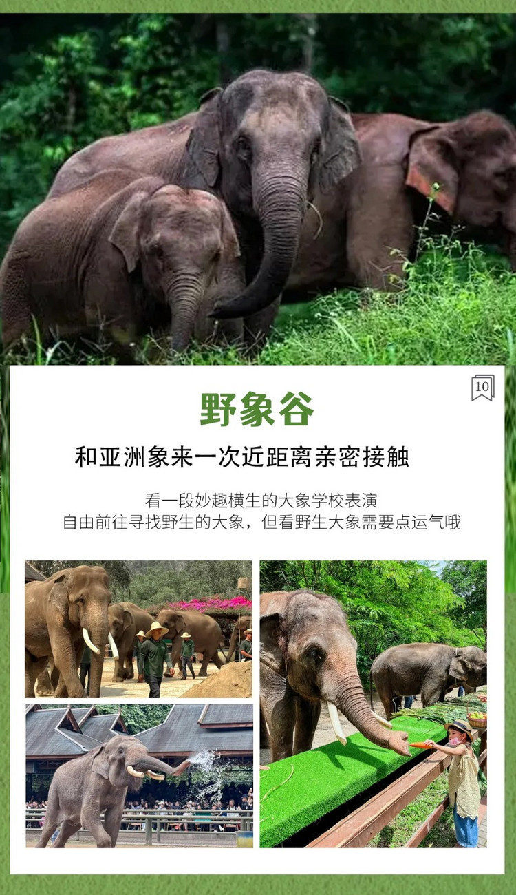 午餐后出发前往【野象谷景区】。我们先去看亚洲象的科普,认识和了解亚洲象。在这里,我们与亚洲象零距离面对面,了解大象喜欢的食物,体重,生活习性等等。再去观光蝴蝶园兰花园等,接着可以自由前往寻找野生的大象,但看野生大象需要点运气哦。